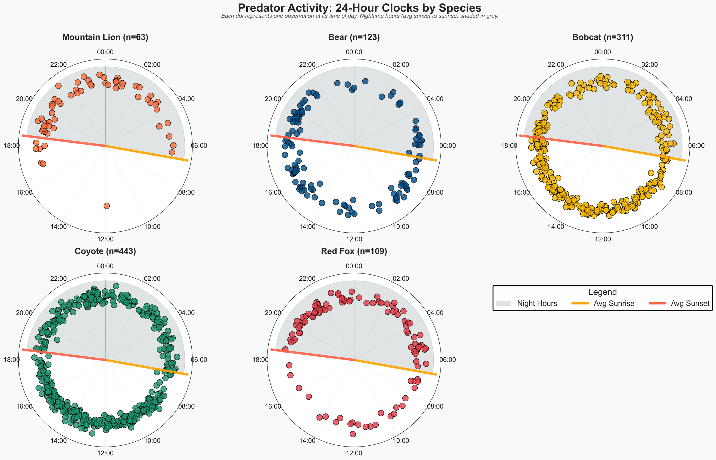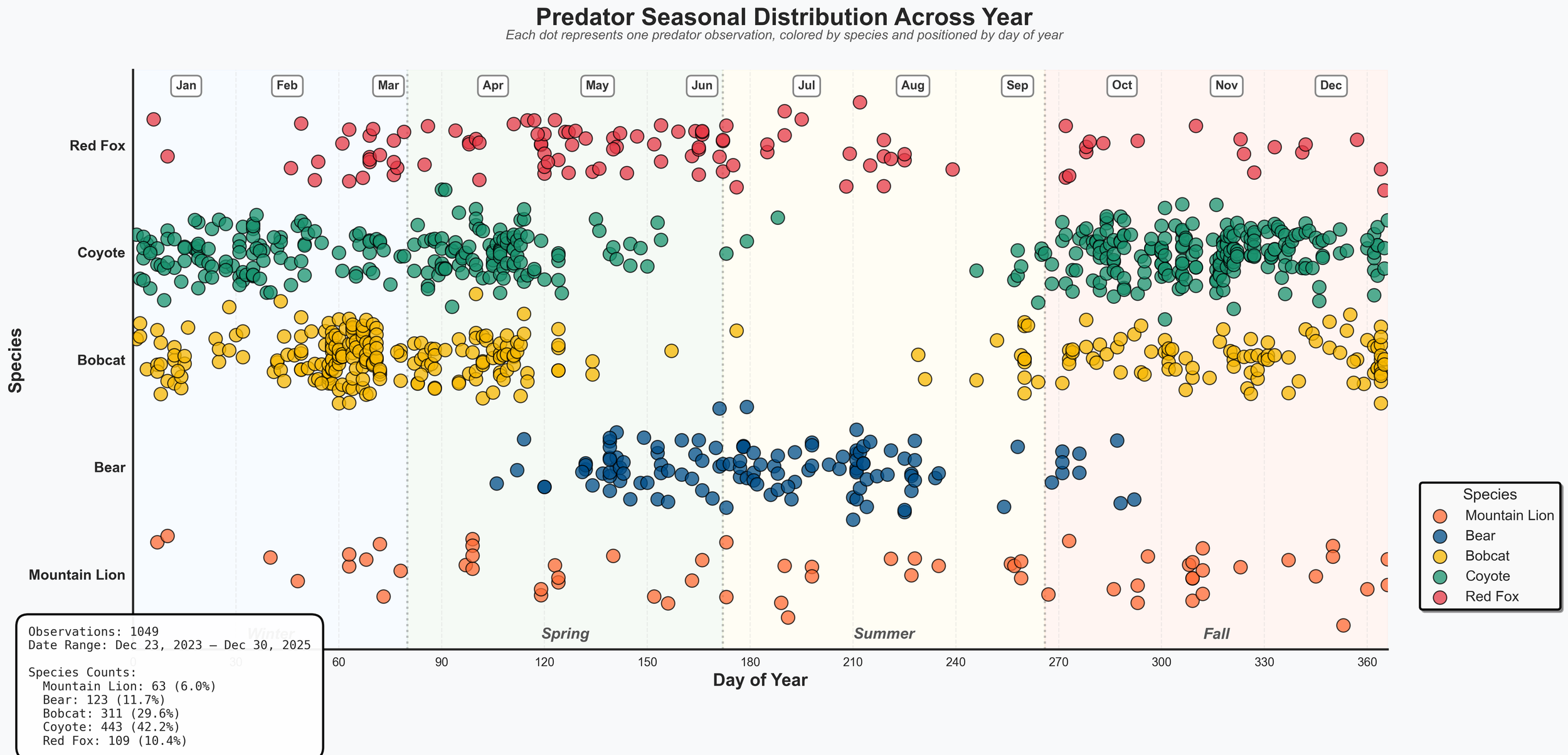 I maintain a set of camera traps across Boulder County. From these traps, I have transcribed over 3.5 thousand observations and have begun organizing the data into figures and visualizations. The figures below show predator movements through the day and year. The large drop-off in bobcat and coyote observations during the spring and summer coincides with flooding of agricultural ditches. Bobcats and coyotes use agricultural ditches extensively (when they aren’t flooded) to move through well-trafficked areas and stay out of sight. This utilization of irrigation ditches is an example of how wildlife adapts to human infrastructure—and how our seasonal cycles (irrigation, grazing, and land management) shape when and where animals can move. If you have specific questions about predator movements or suggestions for using this data, please reach out. I have highlighted predators here, but the data includes any animal who has triggered a camera trap—100 species and counting.